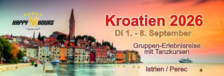 Ihr fliegt mit HAPPY-Stefan, Kerstin und ca. 40 reiselustigen Leute nach Porec/Kroatien (Flughafen Pula ). Eine Woche erlebt Ihr höchst interessante Tanzworkshops, erlebnisreiche sowie spannende Ausflüge und genießt eine nicht mehr zu vergessene Zeit. Wer einmal mit dabei war, ist süchtig und kommt davon nicht mehr los.